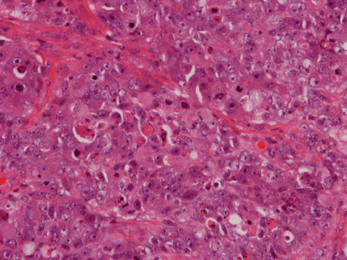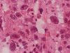 Large cell and anaplastic medulloblastomas are recognized as different variants in the new WHO classficiation 1. They share many basic features with medulloblastoma 2, 3. The most notable differences are large cell size, increased variation of nuclear size, prominent and even eosinophilic nucleoli, increased mitotic figures and number of pyknotic or apoptotic cells, and extensive, geographic areas of necrosis. In the experience of the authors, most of the tumor cells in large cell and anaplastic medulloblastomas have high nuclear to cytoplasmic ratio in a manner similar to that of the classic variant. As per the new WHO classification, large cell medulloblastomas are composed mainly of large cells with more cytoplasm than the classic variant or the anaplastic variant. In the experience of the authors, this distinction is not always possible. The case being illustrated here includes some large cells with substantial amount of cytoplasm and but these cells only represent a portion of the tumor cell population. In general, anaplastic and large cell medulloblastomas have less favorable prognosis than the classic variant of medulloblastoma. However anaplastic changes are uncommon and does not affect the prognosis in adult cases as per one study 4.