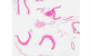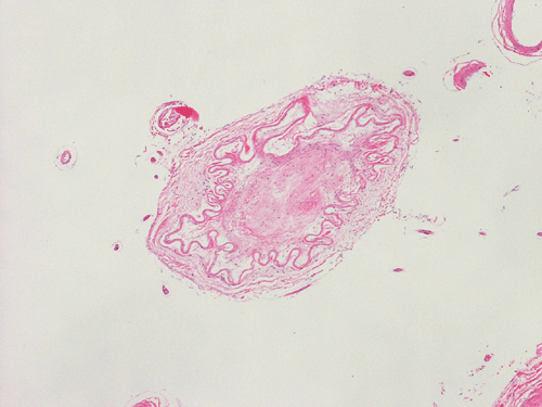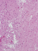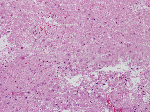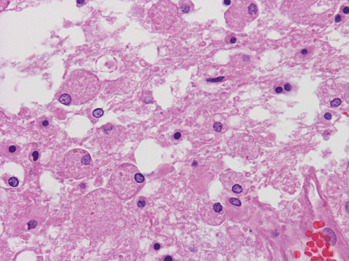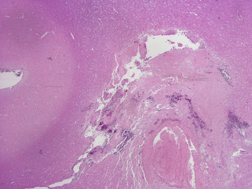 The patient developed low grade fever in the next several days and his temperature started to spike to around 103 °F about 5 days after admission. Laboratory examination at that time showed elevated WBC, with 64% neutrophils, anemic with Hb 8.4. His CSF cultures were negative for bacteria but his endotrachial aspirate was tested positive for Hafnia alvei (Gram-negative rods). He continued to have tachycardia, tachypnea, hyperthermia, and could not be weaned off from the ventilator. Limited family history was significant for intracranial bleedings in several other family members was subsequently established. His condition continued to deteriorate and he developed metabolic acidosis, hypernatremia, hyperkalemia, elevated ALT and AST, markedly elevated creatine kinase, decreased GFR, acute renal failure, and DIC-like coagulation profile on June 2. Both systolic blood pressure and heart rate dropped to the 60s. Despite all possible measures taken, there was no significant improvement on the patient’s condition. On the 19th hospital day, the patient was made DNR and he expired later that day. An autopsy limited to the brain was performed.