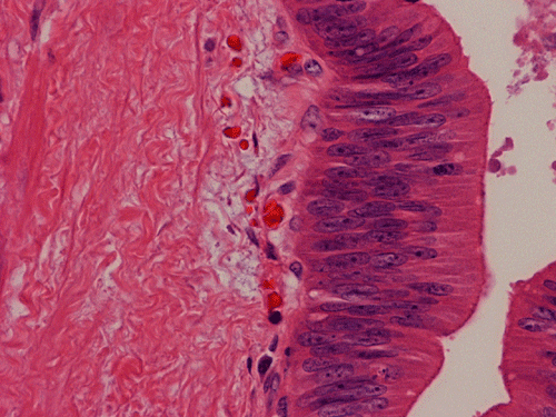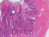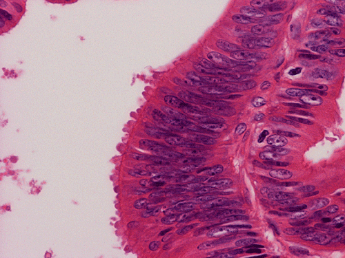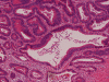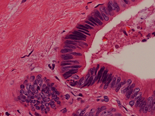 Grossly the inner surface of the ducts is replaced by velvety papillary growths with masses filling the dilated ducts. These soft masses are friable and white to red or tan 1, 2, 4. Microscopic findings include multiple papillary adenomas with fibrovascular cores covered by pseudostratified, columnar biliary-type epithelium with cytoplasmic mucin granules 1, 2. Paneth cells or endocrine cells may be observed and in some regions of the papillae there is crowding leading to an adenomatous appearance 1. BP can be classified into five categories based on the degree of cytological and structural atypia which includes increased nuclear to cytoplasmic ratio, loss of polarity, hyperchromatism, pleomorphism, prominent nucleoli, abnormal mitosis, cribiform pattern, multilayering and the presence of invasion 1, 4, 5 as follow: