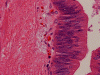 Clinical information: The patient was a 54 year-old woman who was admitted for a laparoscopic cholecystectomy because of cholelithiasis. The operation and recovery were uneventful. On gross examination, multiple small, multifacet black gall stones were present. The mucosa appeared largely unremarkable except for a small and elevated area that appeared particularly furry. The followings are representative images from that area.