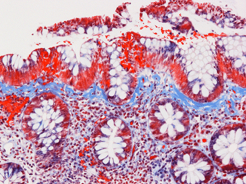 In normal colon, a delicate subepithelial collagen table less than 3µm in thickness is visible just beneath the luminal epithelium. In collagenous colitis, there is abnormal deposition of collagen immediately beneath the basement membrane. This collagen deposition forms a subepithelial band in the superficial lamina propria, which is readily recognizable as a layer of eosinophilic, irregular deposition by hemtoxylin and eosin stain. These abnormal depositions stain positive for collagen on Masson’s trichrome stain. In addition, the thickened subepithelial collagen table incorporates capillaries and inflammatory cells.