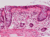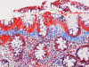 By immunohistochemical staining, this thickened band contains collagens type I, III, and VI as well as tenascin. Immunohistochemistry for basement membrane components, such as type IV collagen and laminin, do not highlight this layer, further confirming that this deposition is collagen rather than basement membrane in nature. On electron microscopy, this layer of collageneous deposition is separated from and beneath the basement membrane. In a same patient, the thickness of this collagenous band can vary throughout the colon and the transverse colon generally has the thickest deposition. The rectum can lack a thick subepithelial collagen band in up to 33% of cases, and in a small percentage of patients, the rectum can be histologically normal with no increase in inflammation. Consequently, multiple biopsy specimens should be taken in areas proximal to the rectosigmoid colon if the clinical suspicion of collagenous colitis is strong 1.