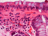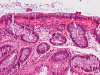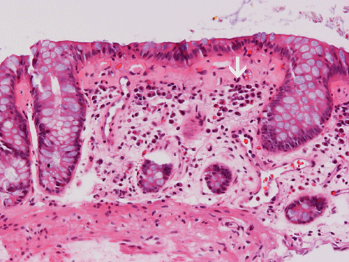 The lamina propria is typically expanded by a mixture of inflammatory cells, including plasma cells, lymphocytes, eosinophils and mast cells. These cells tend to have a “top heavy” pattern and more inflammatory cells are found immediately under the collagenous band than in deep portion of the lamina propria. The other distinctive component of collagenous colitis is increased intraepithelial lymphocytes. The intraepithelial lymphocytes of collagenous colitis are predominantly CD8 cells which express the alpha- beta form of T cell receptor. Surface epithelial damage (flattening, detachment) may also be present 1 but these are non-specific features as they are also present in other form of colitis.