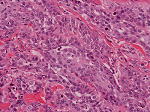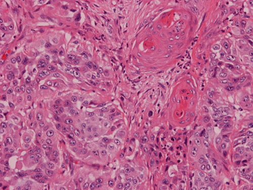 In some areas, the squamous differentiation is slightly obscure.The tumor cells