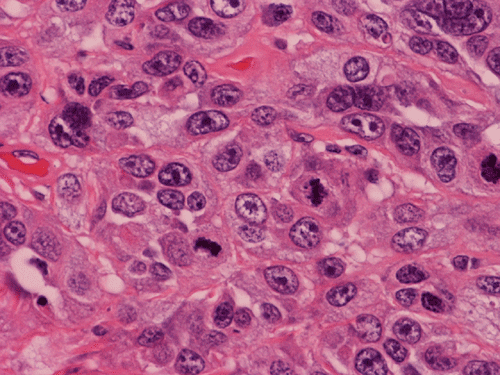 On medium magnification, the tumor is composed of nests of cells that have