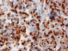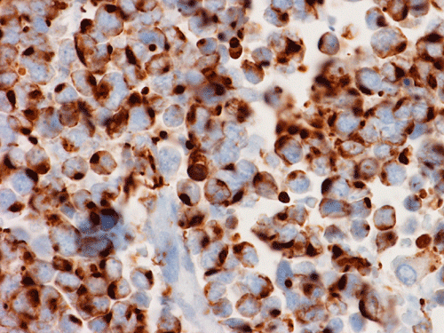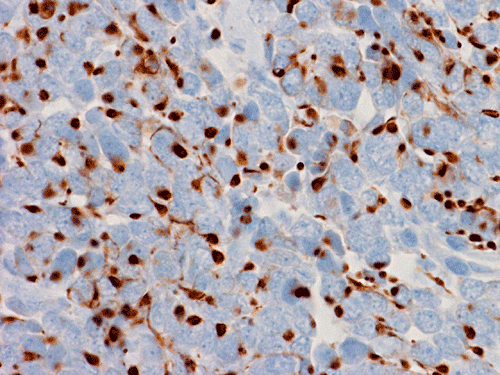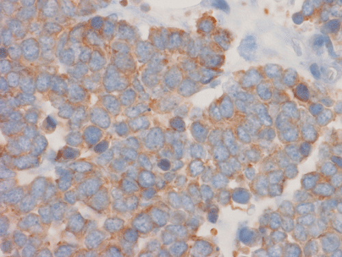 MCC carcinoma expresses low-molecular weight cytokeratins, (keratins 8,18,19 and 20) with cytokeratin 20 being most useful and important in diagnosis 3-10, 13. The characteristic staining pattern is that of a paranuclear dotlike pattern. It has been demonstrated that CK 20 is useful to distinguish MCC from pulmonary small cell carcinoma 13. It is considered both sensitive and specific for MCC since it is not expressed in neuroendocrine carcinomas at other sites, such as small cell lung carcinoma. Up to 30 % of metastatic neuroendocrine carcinomas of the lung may also stain for CK-20, but they can be distinguished based on their positive staining of thyroid transcription factor 1 (TTF-1), which is negative in MCC and positive in pulmonary small cell carcinoma 13. MCC are negative for S100 and Melan A/Mart-1 which helps to differentiate them from malignant melanoma. In addition, MCC are usually negative for vimentin but malignant melanomas are usually strongly positive for vimentin.