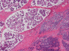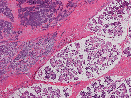 Clinical information: Clinical information: The patient is a 60 year-old man who presented with a 2.5 cm mass in the right parotid area. The mass is non-tender. The overlying skin appears stretched by intact. A partial parotidectomy with the overlying tumor was performed and the followings are representative images.