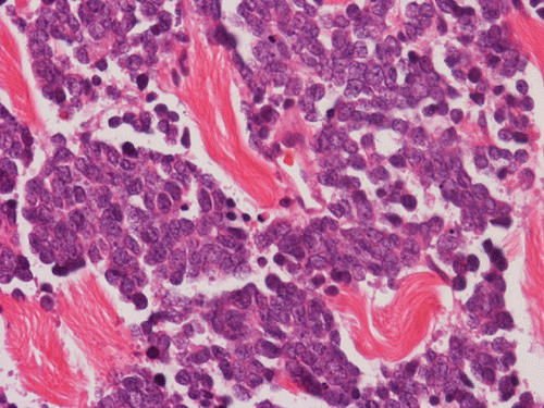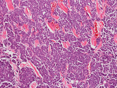The small cell type have features of a small blue turmor with scant cytoplasm and small to medium sized nuclei with salt and pepper chromatin. There are numerous mitosis and scattered pyknotic nuclei. This tumor often expands into the subcutaneous tissue. The small cell type is similar to small cell tumors found at other sites. It also arises in the dermis as solid sheets and cells clusters. The clinical behavior tends to mirror that of small cell tumors of other origin. The least common subtype is the trabecular type, in which the cells are arranged into organoid clusters and trabeculae with ribbons. It often occurs adjacent to adnexal structures. The cells tend to contain more cytoplasm. The intermediate subtype is most frequently seen. It has a solid and diffuse growth pattern. Cells are less compact and contain less cytoplasm than the trabecular subtype and they usually arise adjacent to adnexa, although it can invade the epidermis. Typically they are mitotically active and necrosis is not uncommon. It has a more aggressive clinical behavior than the trabecular subtype.
