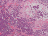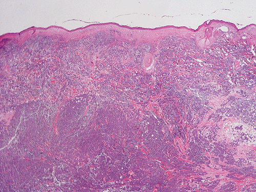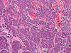Histologically, MCC is a dermal based tumor. Histological features often typify that of small, round blue cell tumors. The cells have very high nuclear cytpplasmic ratio, hyperchromatic nuclei with evenly distributed chromatin without prominent nucleoli. Mitotic figures are common. The tumor is characteristically separated from the epidermis by a "grenz" zone. It can be morpholgoically classified into three subtypes, namely the small cell type, the trabecular type and the intermediate type.