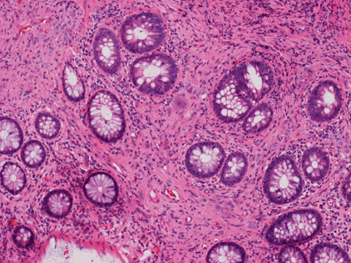 Ganglioneuromatosis is essentially hypertrophy of the autonomic plexus of the gastrointestinal tract which could involve both the submucosal and myenteric plexus. The hypertrophy is diffuse. These lesions are large, poorly demarcated, and can distort the surrounding tissue architecture. Intestinal ganglioneuromatosis has been reported in patients with NF1 1, Cowden’s disease 6, juvenile polyposis 7, and Ruvalcaba-Myhre-Smith syndrome 2. In most cases, the lesions are limited to the mucosa. In fact, a mucosal and transmural type has been recognized by some investigators 8. Sporadic cases with well characterized mutaions have also been described 9, 10 but no specific genetic aberrations have been identified in most cases. Although the coexistence of intestinal ganglioneuromatosis and colorectal adenocarcinoma has also been reported, the link has not been established 11.