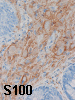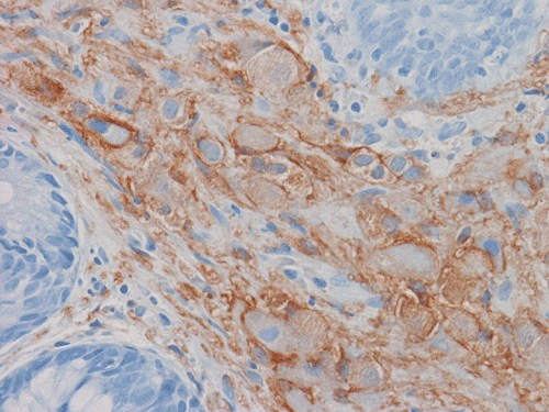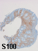 Pathology of the Case: The lesion is a small polypoid nodule of mucosa. At scanning magnification, there seems to be a mucosal flattening with erosion. There is focal reduction of glands and increased spacing in between glands (Panel A). Mucin production by the glandular epithelium is normal and there is no inflammatory cell infiltration (Panel B). There is no epithelial proliferation. On the other hand, the glands seems to be separated by spindle cells reminiscent of peripheral nerve(Panel B). On high magnification, there are some large neuronal or ganglionic appearing cell clusters in the lamina propria (Panel C). These neural tissue and ganglionic cells are positive for S100 protein (Panel D and E).