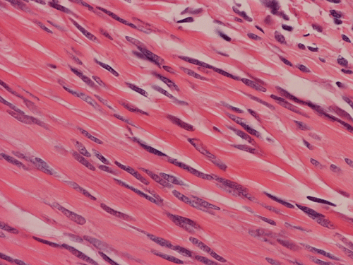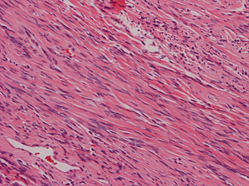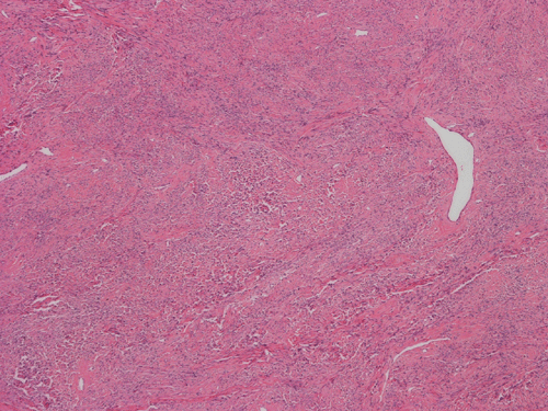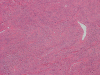 Pathology of the Case: The excised specimen is a 61 gram, 5.4 x 4.3 x 4.2 cm solid, rubbery to firm, basically round nodules. The external surface is smooth and glistening in about 70% of the areas with the remaining areas adhered to small amount of fibrous tissue. The cut surface is pink to tan with a whorled pattern. There was no hemorrhage or necrosis. In some areas, the cut surface is a little gritty and contains small opaque dots, 0.1-0.2 cm in greatest dimension, that are suggestive of calcification.