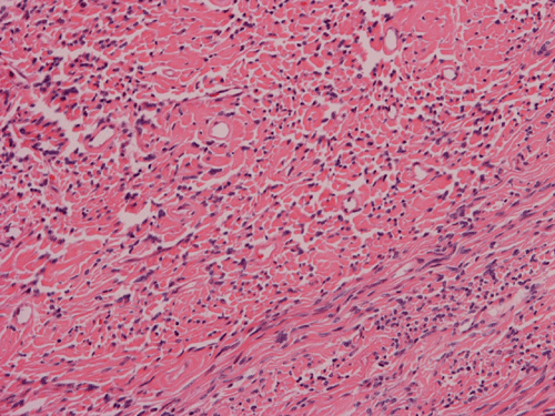 Histologically, the tumor is composed predominantly of strands of collagen fibers arranged in interlacing bundles (Panel F, G, H, I, J ). The histologic pattern is rather homogeneous among different areas and no area with particular hypocellularity or hypercellularity are found (Panel F). In between the collagen fibers are cigar shaped nuclei without high grade features (Panel J). The nuclei and the collagen fibers maintain an interesting regularly randomized relationship reminiscent of a checker board pattern (Panel I). A few small fragments of entrapped, mature bone are also found within the tumor. Mitoses and necrosis are not seen.