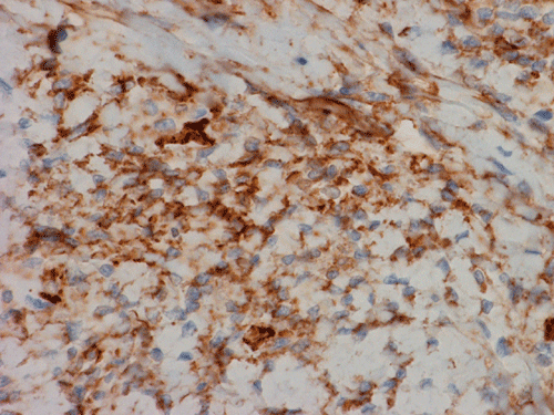 CD34 is expressed in about 90% of the pleural cases. Other molecular markers including Bcl-2, CD99, epithelial membrane antigen (EMA), and actin have also been demonstrated to be positive, but cytokeratin, SMA, desmin, S-100, EMA, HMB-45, and c-kit are usually negative 9.