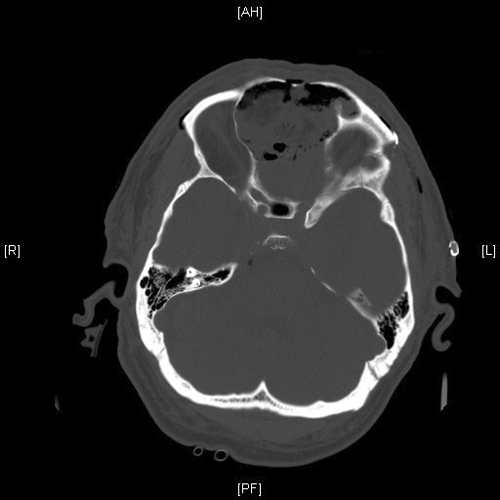 Clinical information: The patient was a 54 year-old man who came to our clinic with the chief complain of a swelling between his eyes for 18 months. He reported frequent headache, changes in vision including double vision and decreased ability to smell. There was also minor changes in taste and dizziness but he did not report any syncope events. Physical examination revealed widening of nasal bridge and hypertelorism. His facial expression, motility, and strength are preserved. The pupils are equal, round and reactive to light. A CT scan and MRI was performed and demonstrated a large cystic mass as illustrated below. A biopsy was performed through the nasal cavity which yielded small fragments of spindle cell neoplasm with no high grade features demonstrated. Based on the biopsy result, the mass was excised and yielded the following representative images.