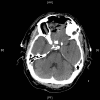 Radiologic Images of the Case: CT scan demonstrated a large midline mixed density mass with fat density that occupies the ethmoid sinus with extension through the cribiform plate into the inferior portion of the anterior cranial fossa. The mass is 5.1 x 3.2 cm in greatest dimension (Panel A). Bone windows of CT scan demonstrated bone expansion suggestive of remodeling (Panel B). On MRI, spoiled gradient recalled (SPGR ) post contrast images showing mass is either avidly enhancing or bright on T1 precontrast. (Panel C). The mass hypointense signal intensity compared to brain parenchyma with surrounding areas of increased signal (suggestive of entrapped mucus) on T2 weighted images (Panel D and E).
