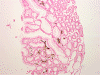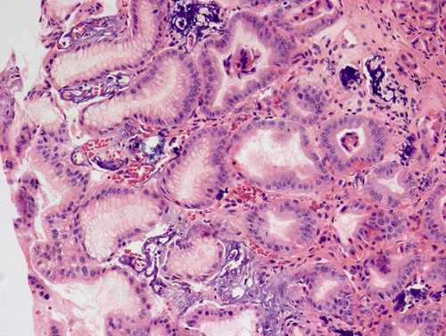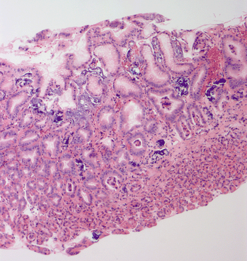 While there is often no associated pathology with gastric mucosal calcinosis, there are reports of associated reactive gastropathy 4, chronic active gastritis 6, foveolar hyperplasia 4, 6, atrophic gastritis 16, ulceration 4, and mucosal edema 4. It is unclear how significant the association with gastric mucosal calcinosis is with any of these conditions. There is no evidence that Helicobactor pylori infection is associated with gastric mucosal calcinosis 1.