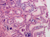 Clinical follow up on this case: Serum calcium and phosphate levels remained persistently elevated and the patient developed systemic medial calcifications of arteries (calciphylaxis) with associated wounds on the upper extremities and abdomen. Parathyroidectomy was performed 5 months after the current biopsy for secondary hyperparathyroidism. This helped normalize calcium and phosphate, but the patient unfortunately died one year later from complications of long-standing coronary artery disease, possibly compounded by calciphylaxis. An autopsy was not performed.