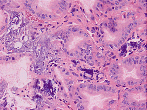 Gastric mucosal calcinosis has been classified as either metastatic, dystrophic, or idiopathic 1, 3. In metastatic calcification, the most common cause of calcinosis is calcium salts deposit in normal gastric tissue as a result of altered serum electrolytes: classically hyperphosphatemia and hypercalcemia. Diseases associated with metastatic calcification include end stage kidney disease 2, 8, 9, primary hyperparathyroidism 7, 10, multiple myeloma 11, 12, metastatic malignancy, hypervitaminosis D 7, 13, and the tumor lysis syndrome 14. Serum elevations of calcium and phosphate result in increased formation of insoluble calcium phosphate salts 9. The solubility of calcium phosphate is inversely related to pH, resulting in deposition of calcium precipitates in the relative alkaline conditions of the superficial gastric lamina propria, as well as in the kidneys, lungs, and left cardiac chamber 1, 7.