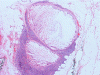 Cervical thymic cysts can vary in size up to few centimeters, may be unilocular or multilocular. The lateral location is a good clue to support the diagnosis. The cyst contents vary from clear serous fluid to hemorrhagic or purulent fluid. They may contain semi-solid, gelatinous, necrotic debris, blood or cholesterol crystals (like this case). Thymic parenchyma, lymphoid tissue and Hassall’s corpuscles found within the cyst wall are considered pathognomic findings. The cyst wall may be devoid of epithelial lining or may have cuboidal, stratified or ciliated epithelium. Identification of the Hassall’s corpuscles is the key to correct diagnosis and sometimes they may not be abundant. Secondary changes due to hemorrhage are also common findings. Sometimes, pressure necrosis may lead to granulation tissue. No ectopic thyroid tissue should be present. The diagnosis is usually straight forward.