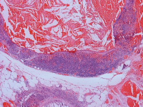 Histopathology: The lesion is encapulated cystic structure with the wall lined by nodules of lymphoid tissue (Panel A and B) that are devoid of any evidence of hematopoiecic malignancy. Within this lymphoid tissue are small pink islands (Arrow in Panel C) and on higher magnification (Panel D) these islands are squamous cell nests. These islands are Hassell corpuscles and the lymphoid tissue is in fact thymic tissue. The cyst appears to have sustained repeated hemorrages. Both recent hemorrhage (Panel E) and cholesterol clefts consistent with resolved hemorrhage (Panel F) are present.