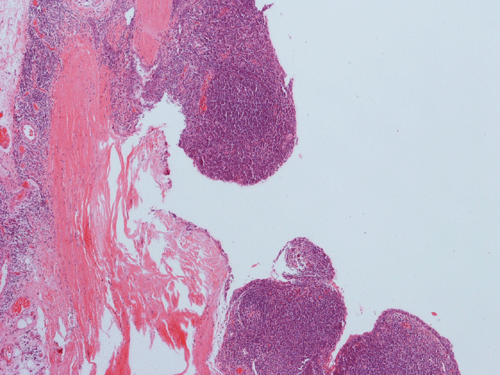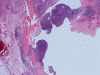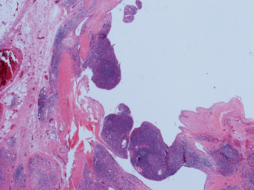 Gross Pathology: The specimen is 4.0 x 1.2 x 1.2 cm, pink-tan to red, soft to firm and nodular mass. It appears to be cystic on cut section and has multiple lobules ranging from 0.2 to 0.7 cm in the maximum diameter. The cystic spaces contain sero-sanguinous fluid. The specimen is serially sectioned and entirely submitted for histologic examination.