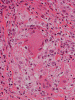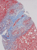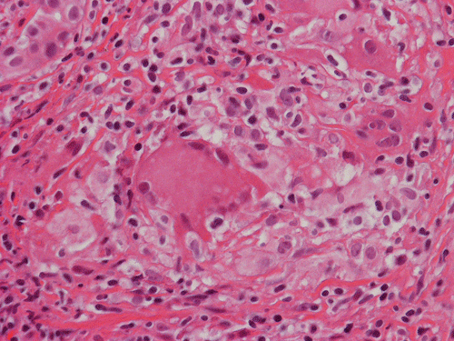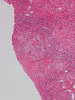 Histopathologic features of sarcoidosis include scattered granulomas in the liver, which may tend to be portal or periportal. Multinucleated giant cells, epithelioid cells, and a variable but usually minimal inflammatory cellular response is present. The granulomas, like in sarcoidosis occuring in other organ systems, tend to be well-demarcated or "clear cut", several granulomas are often comparable in size, and necrosis is not typically present. Asteroid bodies, intracellular vacuolated structures resembling a sea anemone, may be found within the giant cells. Large basophilic, round to roughly oval, and concentrically laminated, Schaumann bodies may be evident in the sarcoid granuloma. None of these inclusions are pathognomonic feature of sarcoidosis, however, do suggest this diagnosis. Ductopenia, cholestasis and features of chronic cholestasis resembling PBC have been described in the cases of sarcoidosis. Severe fibrosis and cirrhosis in conjunction with portal hypertension may be present in sarcoidosis. End stage liver disease in sarcoidosis has been successfully treated by orthotopic liver transplant and recurrent disease has been reported in one such case. Reticulin fibers has a tendency to extend into the granulomas as illustrated in this case.