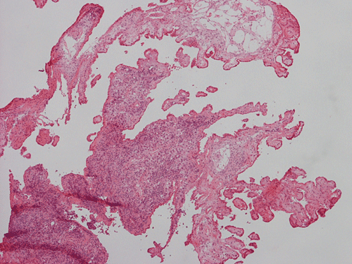 Clinical information: This patient was a 24 year-old Caucasian male who presented to the Emergency Department with a 6 month history of blurry vision with occasional diplopia and problems with horizontal eye movements. Patient reports during the past 6 months he had also been experiencing increasingly severe headaches, fatigue, an unintentional loss of 70 lb in weight, decreased hearing bilaterally, and increased urination and thirst. Patient reported no significant past medical history. Family history was noncontributory. Patient stated prior heavy alcohol use of 1 year duration, an eight pack year smoking history, and use of methamphetamine and cocaine. Physical exam revealed an overall slowness in mentation and movements. Neurologic exam revealed paralysis of vertical gaze, loss of accommodation and a positive Romberg. Abnormal laboratory values found included decreased luthenizing hormone (LH) of less than 0.1, decreased follicle stimulating hormone (FSH) of 0.45, and elevated prolactin of 34.48. The carcinoembryonic antigen (CEA) level in serum was 1.15 ng/mL, alpha fetal protein (AFP) less than 0.5 ng/mL and elevated human chorionic gonadotropin (HCG) at 145.9. Both CT scan and MRI were performed and an endoscopic biopsy was performed. The followings are representative images form the imaging studies and pathologic specimen from the pineal gland.