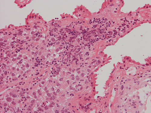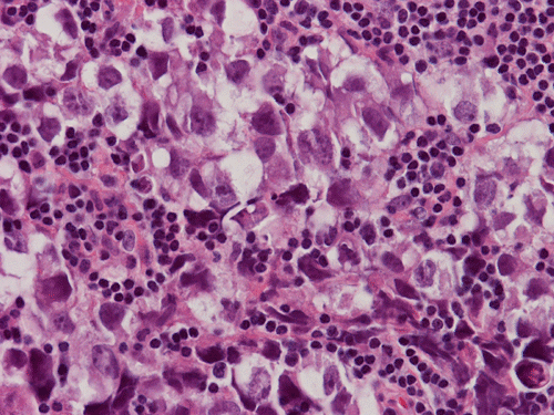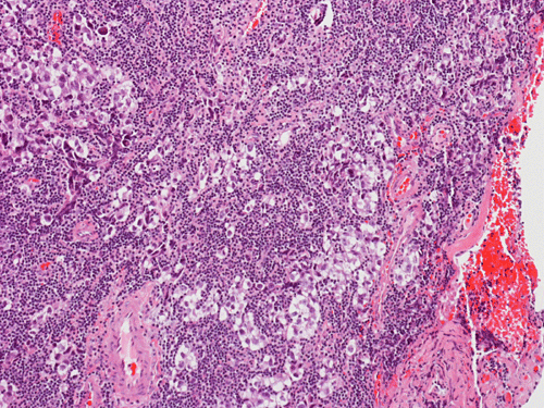 The discussion here will be limited predominantly to germinoma. Histologically, germinoma has very characteristic features heralded by large, atypical germinoma cells in a background of benign lymphocytes. The germinoma cells are usually huge, with a moderated amount of cytoplasm, and with prominent nucleoli. These cells, even though large, are rarely bizarre. The proportion of germinoma cells with lymphocytes can be highly variable. While most cases show a good mix of both component, the small biopsies yielded by endoscopic biopsy can sample in areas that are lymphocyte predominant or germinoma cell predominant areas which lead to diagnostic pitfalls. It should also be reminded that germinoma has a strong tendency to undergo granulomatous changes. Such granulomatous changes may completely efface the usually big cell-small lymphocyte classic pattern. These biopsies, however, would histologically suggest infection but the clinical history usually would not. Knowing the clinical history is often helpful. Trophoblastic cells could be seen and their presence may indicate a worse prognosis for germinomas. Non-seminomatous component such as embryonal cell carcinoma, yolk sac tumor (endodermal sinus tumor), and choriocarcinoma should also be identified if present.