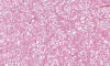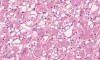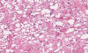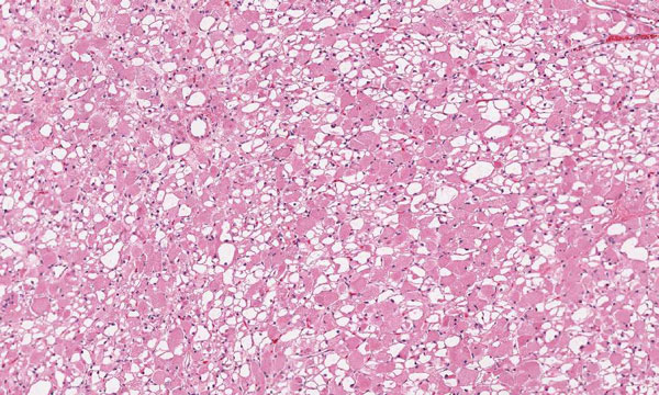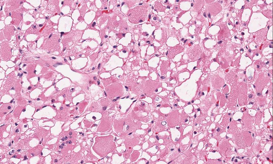 As illustrated in this case, these tumors has characteristic histologic features. Adult rhabdomyomas have similar features among tumors and composed of a checker board arrangement of large polygonal cells with solid amphopilic to eosinophilic cytoplasm and cells with a large cytoplasmic vacuole. Striations reminiscent of striated muscle can be seen. Phosphotungstic acid hematoxylin (PTAH) stain may help to highlight these striations. Also present in the cytoplasms are small amoung of bright eosinophilic, rod-shaped crystalline substances and these substance probably represent Z-band (Z-disc) material. These rods are well illustrated by PTAH stain. The nuclei are small, bland and are usually eccentrically located reminiscent of mature skeletal muscle. Occasionally there are cells with centrally located nuclei with contracted cytoplasm associated with vacuoles at the periphery of the cell. The contracted cytoplasm will give a shape that vaguely suggestive of a spider and these cells are known as "spider cells".