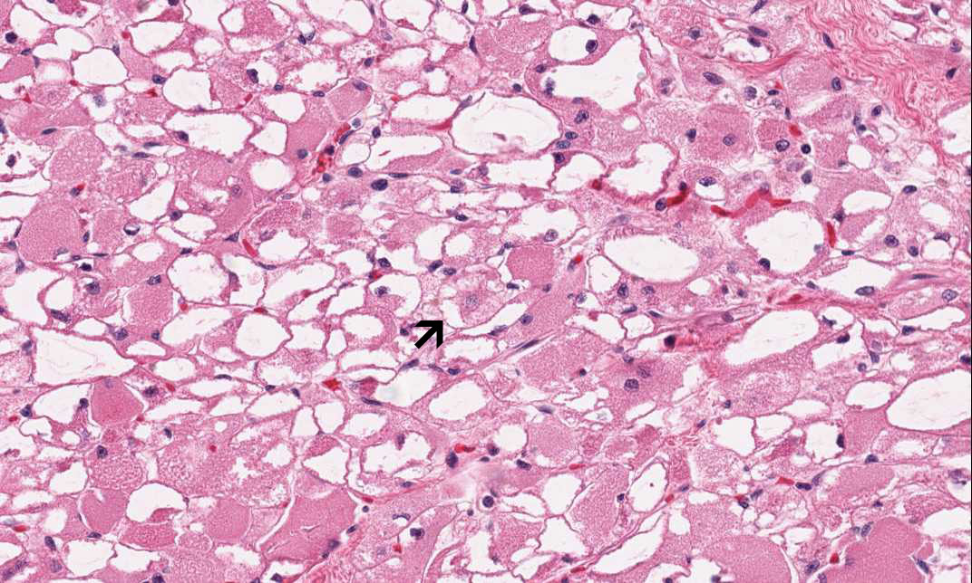 Pathology of the Case: Different parts of the tumor have rather homogeneous appearance (Panel A) which reflect the solid, homogeneous cut surface on gross pathology. Neither necrosis nor hemorrhage are present. On medium magnification, the tumor is composed of large, polygonal cells with distinct cell borders (Panel B) and eccentrically located, small, bland nuclei. The tumor cells are separated by thin fibrous septa with delicate blood vessels. Many of the cells have solid, amphophilic to slightly eosinophilic cytoplasm and other cells have large, clear cytoplasmic vacuoles. These two types of cells arranged in a checkboard type of arrangement. Small amount of brightly eosinophilic, crystalloid like substances are in the cytoplasm of cells with solid cytoplasm (arrow in Panel C). Occasional cells have centrally located nuclei and there are multiple peripheral vacuoles which makes the cytoplasm reminiscent of a spider (arrow in Panel D). These cells are known as "spider cells". Muscle striations are not conspicuous in this case.