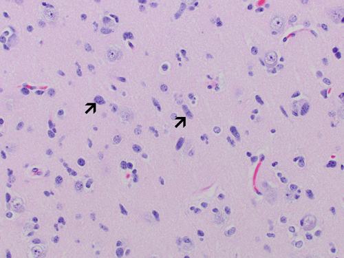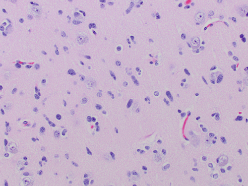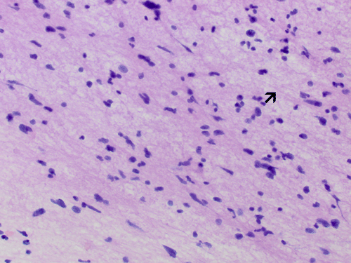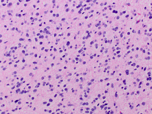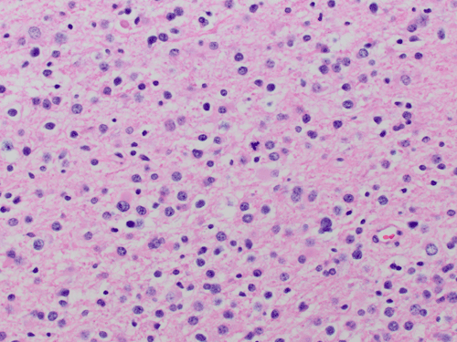 neoplastic glial cells in a background of non-neoplastic cells. This is a