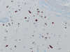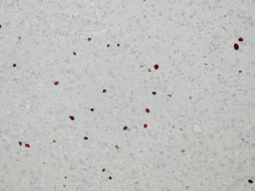 In small stereotactic biopsy with a low density of infiltrating glioma cells, immunohistochemistry can be used to confirm the diagnosis. In the experience of the author, Ki67 is the most useful one as it would light up the atypical cells. When Ki67 is used for this purpose, one must know that some reactive condition can lead to also a modest increase in Ki67 positive cells but these cell should not have the enlarged and atypical nuclei. Also, gliomas do not tend to have as high labeling index as medulloblastoma. The lack of Ki67 positive is not full prove for the absence of cancer. Immunohistochemistry for IDH1-R132H can be used to light up the tumor cells and this one is rather specific. Also, it lights up most if not all tumor cells so the problem that only some tumor cells are labeled by immunohistochemistry for Ki67 would not happen here. However, gliomas in older patients are often negative IDH mutation and negative for IDH1-R132H. When the tumor density is too low, molecular testing of IDH1 and IDH2 mutation will not be helpful as it would be below the detection limits.