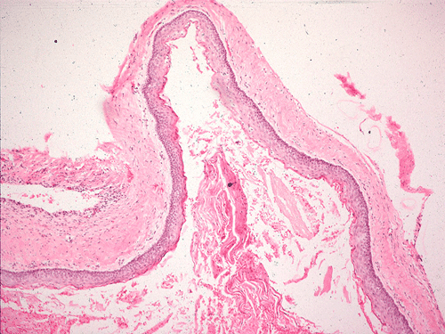 This is a cystic neoplasm lined by keratinizing squamous epithelium without atypia, with keratinaceous debris in the lumen similar to that seen in epidermal inclusion cyst. A creamy cystic content may be seen during surgery. The palisading basal layer is a good hint for recognizing this entity. Orthokeratinized odontogenic cysts do not have this palisading arrangement and they have much lower recurrence rate. The parakeratosis also separate this entity from orthokeratinized odontogenic cysts. It can be unilocular to multilocular. It can be inflamed. Marsupialization of the cyst and flushing with caustic agent will change the morphology and lead to a nondescript stratified squamous epithelium with chronic inflammatory cell infiltration in the supporting stroma. Satellite cysts can be seen at the periphery of the tumor and may be related to recurrence therefore these features should be reported. This tumor can perforate bone.