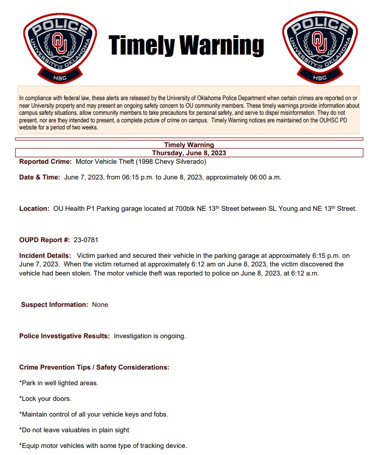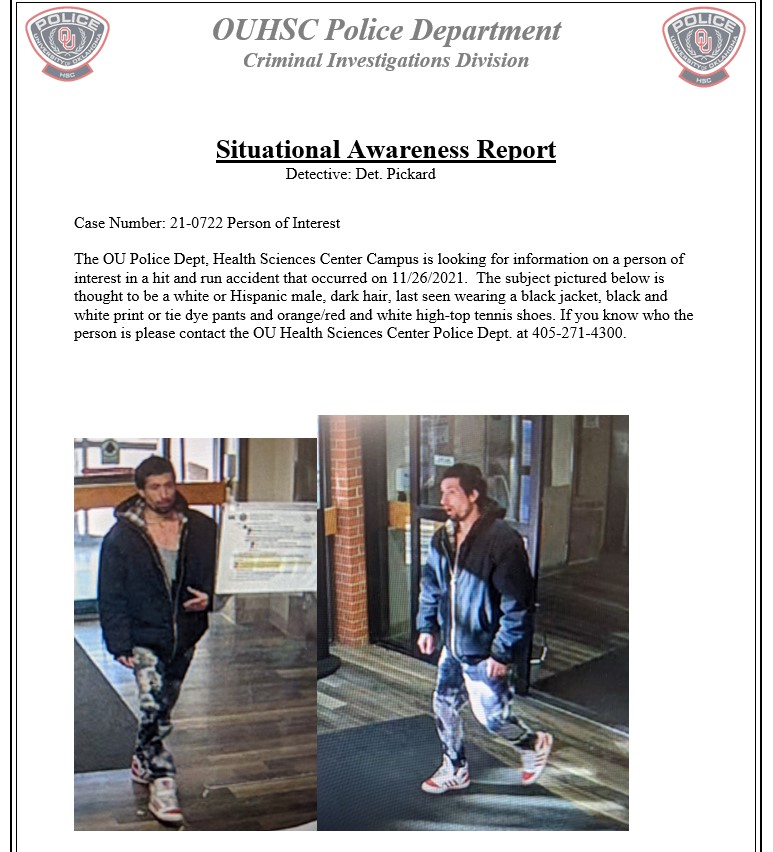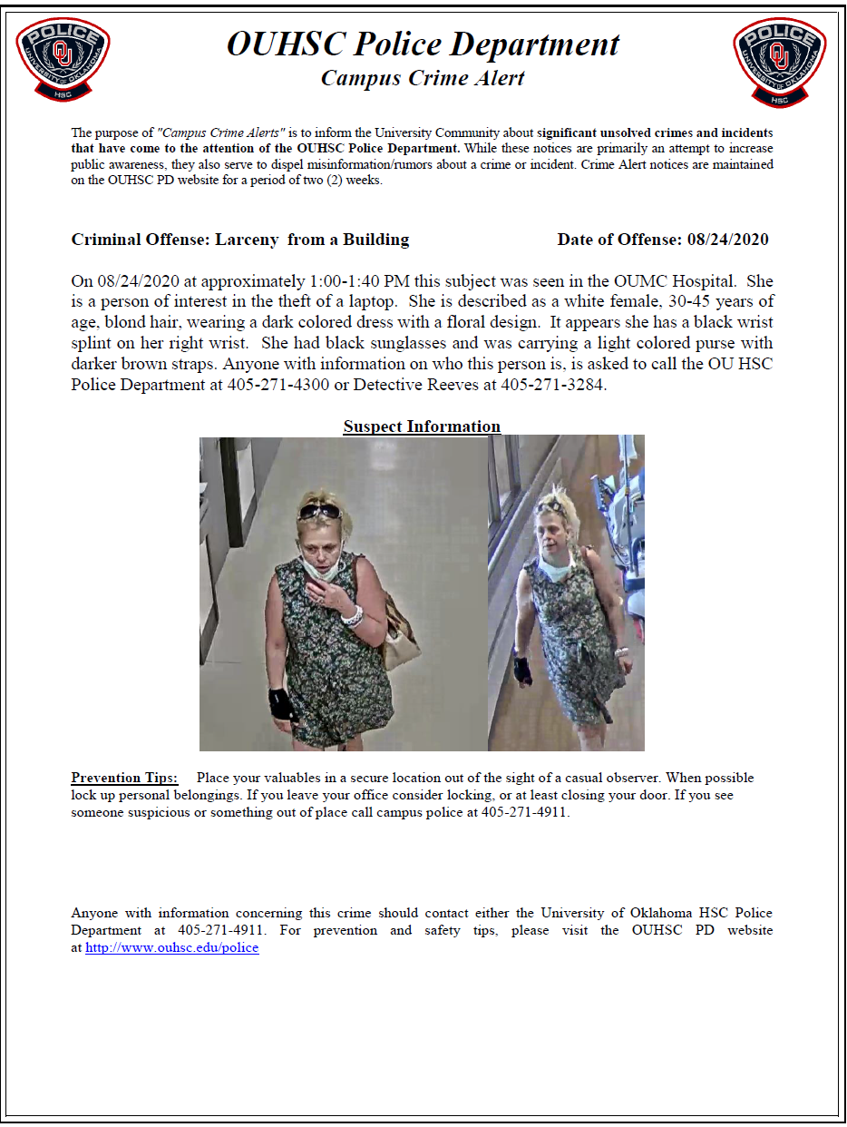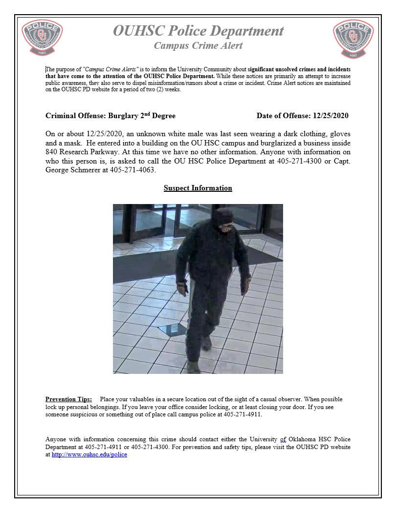 Anyone with information concerning this crime should contact either the University of Oklahoma HSC Police Department at 405-271-4911. For prevention and safety tips, please visit the OUHSC PD website at http://www.ouhsc.edu/police